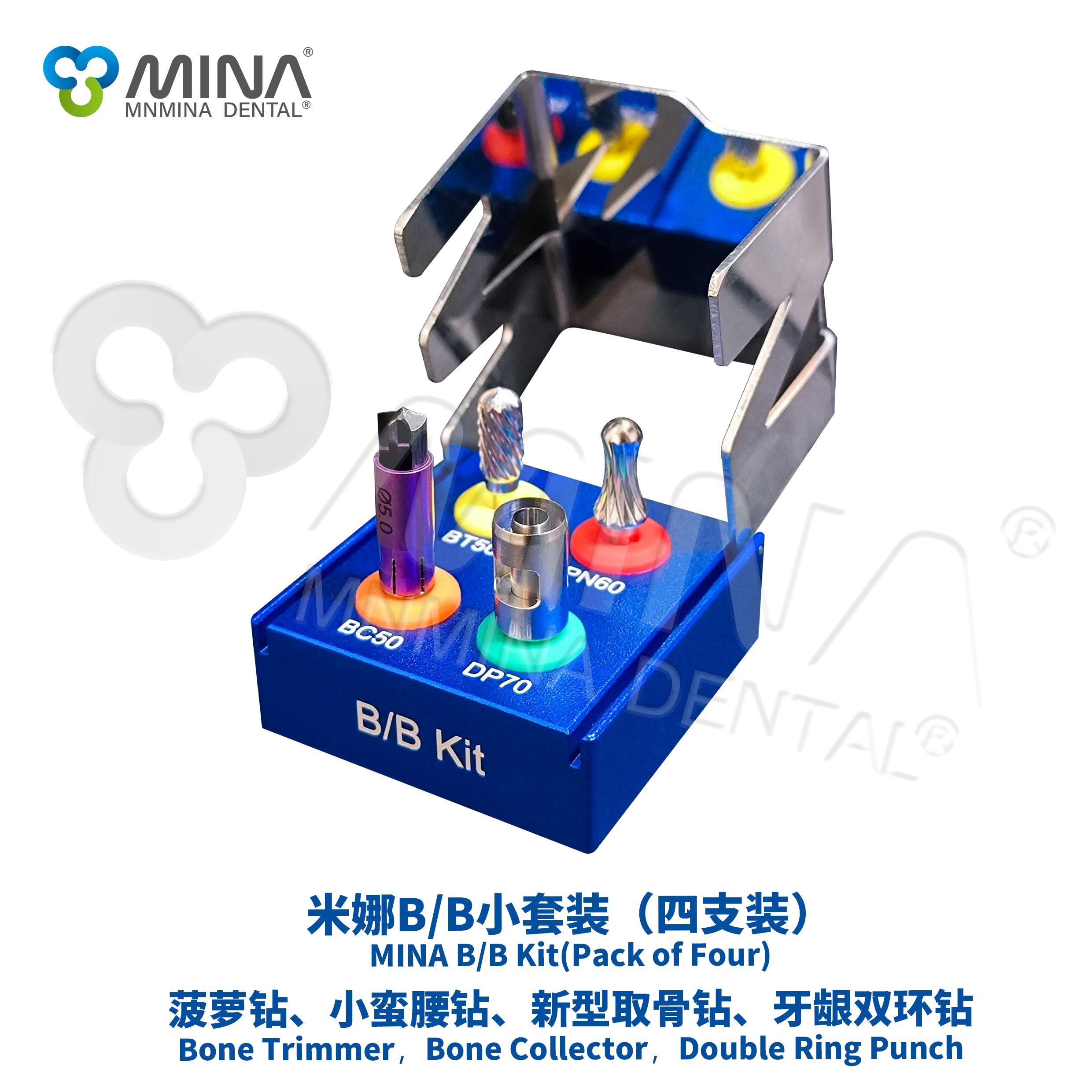 The B/B kit is used for grinding irregular bone surfaces, collecting autogenous bone chips.producing keratinized gingiva etc., which can meet various needs during operation.
